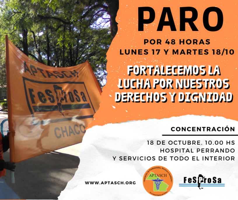En ese marco, el martes 18/10 realizaremos concentración y asamblea, desde las 10.00 horas, en el Hospital Perrando de Resistencia, y en todos los establecimientos del interior de la provincia.