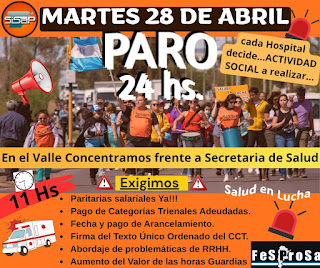 En Chaco, Aptasch inició hoy, 28 de abril, un paro por 24 horas. Exigen la apertura de paritarias, el pago de categorías adeudadas, el aumento del valor de las horas de guardia y el fin de la precarización laboral, entre otros puntos. Además Aptasch convocó para este jueves, 30 de abril a una marcha contra el ajuste. Concentrarán desde las 18:30 horas en la Plaza 25 de Mayo. Reclaman una recomposición salarial urgente, el fin de la precarización y la implementación de la carrera sanitaria.