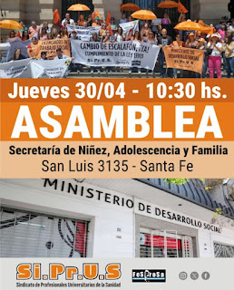 Siprus llamó a asambleas en Santa Fe y Reconquista. En la capital provincial exigen el cumplimiento de la Ley 13.913 de cambio de escalafón y reconocimiento profesional, la mejora inmediata de las condiciones de trabajo y el reconocimiento de quienes trabajan en el territorio, entre otros puntos. La convocatoria es para este jueves desde las 10:30 horas en la Secretaría de Niñez, Adolescencia y Familia de la capital provincial. En Reconquista, la asamblea de salud mental será mañana a las 19:30 horas en la sede de ATE, frente a la crisis que atraviesa el sector.